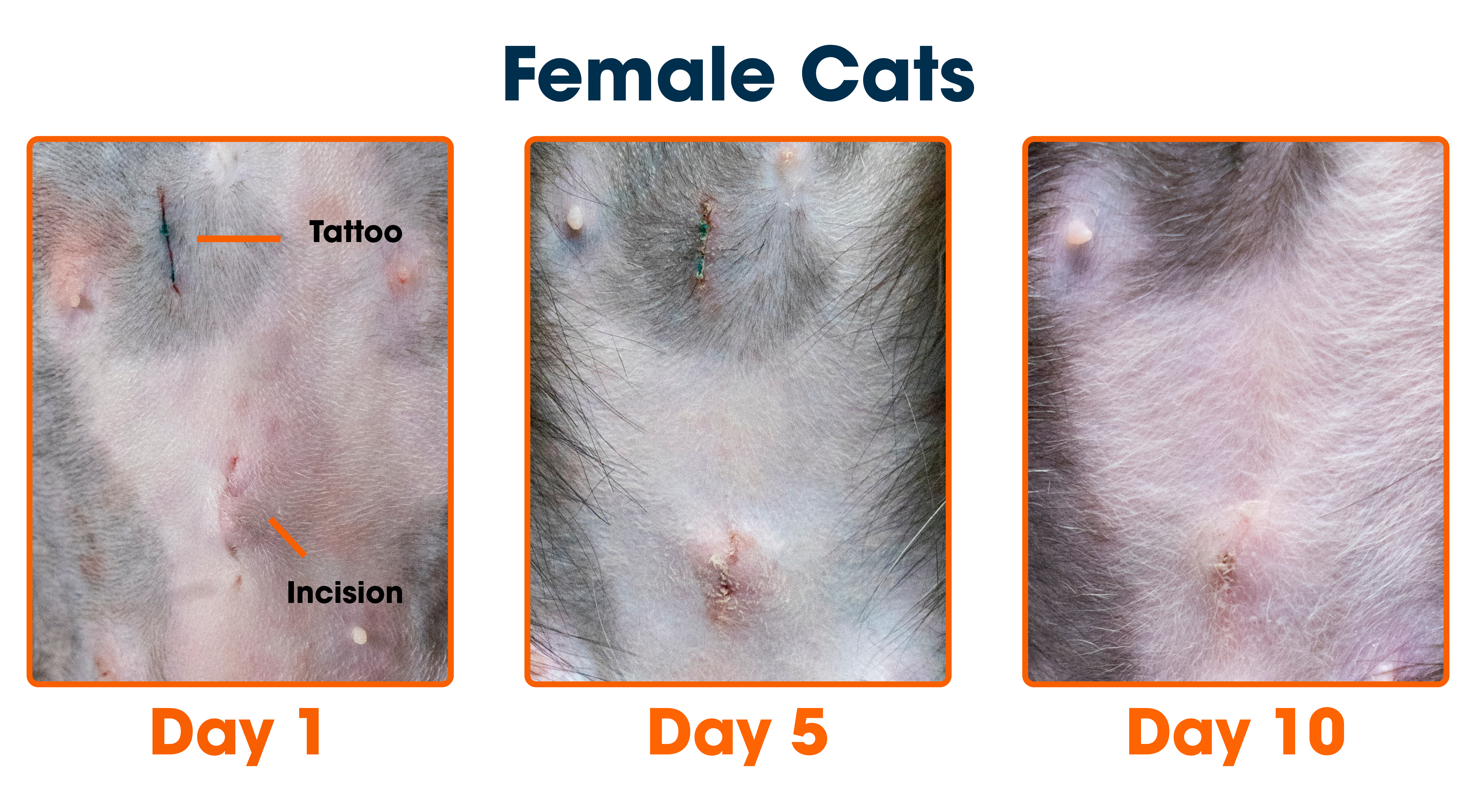The pictures below show what a normal, routine incision should look like during the healing process. The small green tattoo should heal similarly to those seen in the images. You can refer to these pictures as you monitor your pet’s incision during their recovery from surgery. Your pet’s incision may not match the pictures if your pet had an unusual surgery due to pregnancy, uterine infection or retained testicles, which may result in larger or multiple incisions.