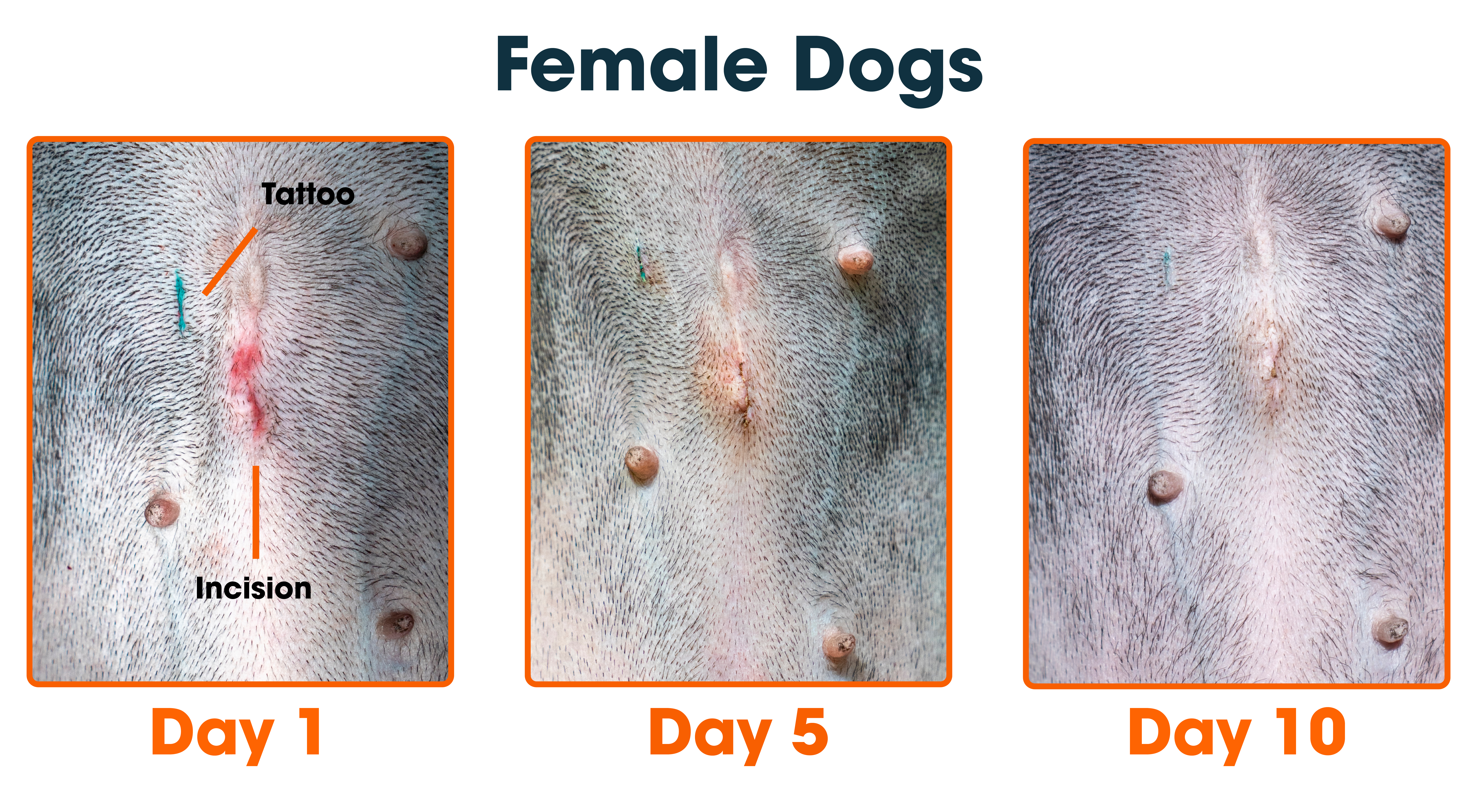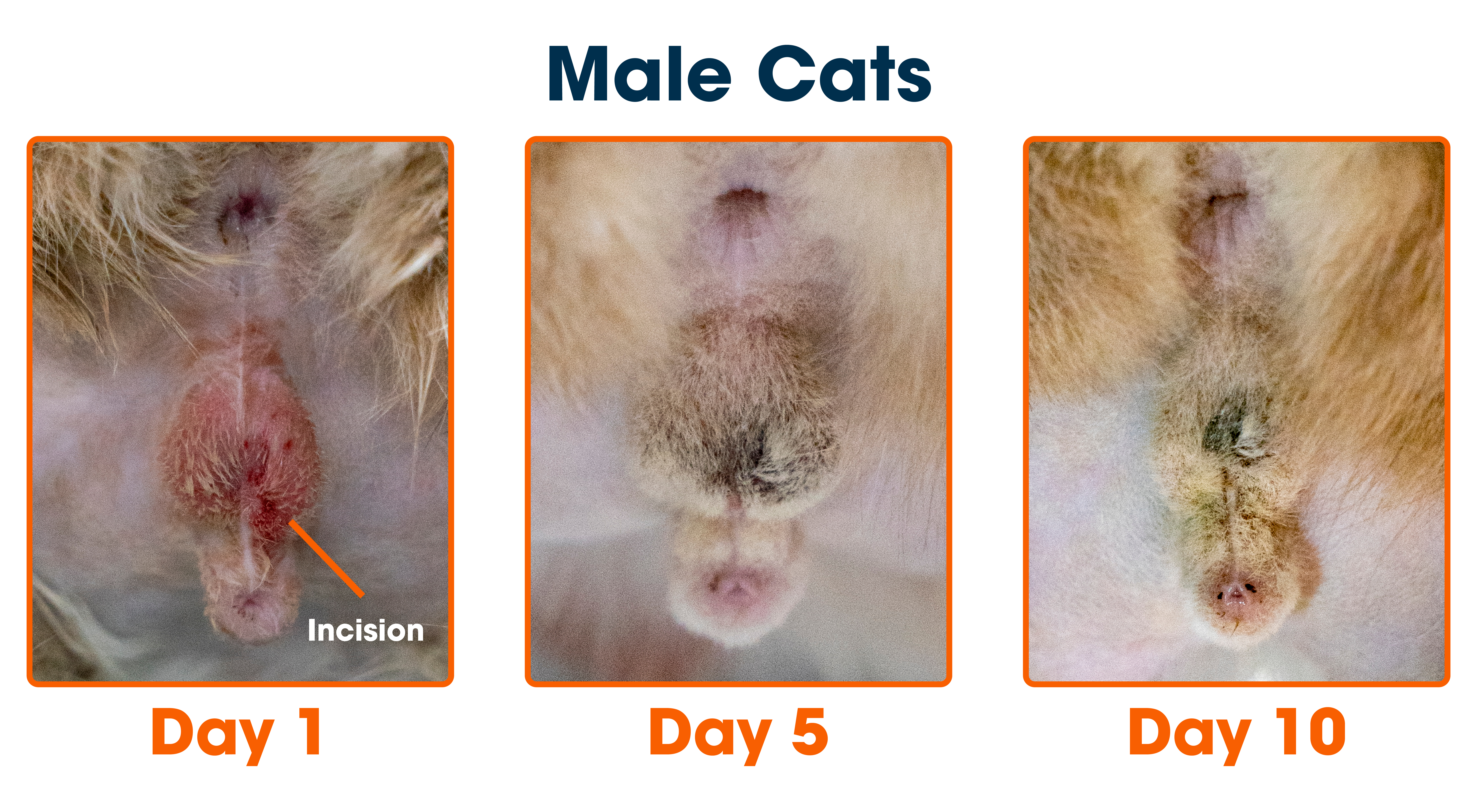 Female dogs and cats have a mid-line incision in their abdomen. Male dogs have an incision on the scrotum, and male cats have two incisions, one on each side of the scrotum. Check these incision sites at least twice daily. What you see when we discharge your pet is what we consider normal.