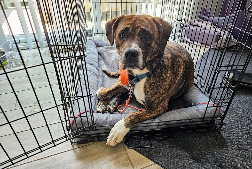 Whether Carmen is chasing squeaky balls in the yard, lounging in a sunny window or curling up on the couch for a good snuggle, she soaks it all in. She’s curious, affectionate and always up for a game of fetch. She’s a total pro and will happily keep the game going as long as you’re willing! This foodie will also work for a tasty treat, which makes training an easy bonding experience. She’s adjusting well to home life — she is doing well with crate time, sleeps quietly through the night and rides calmly in the car with the breeze in her face.