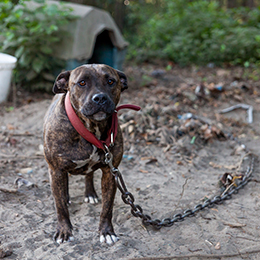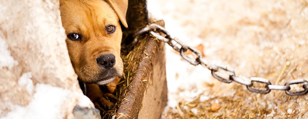 - Dogs on heavy chains, tethered to a tire axle or dog house/barrel