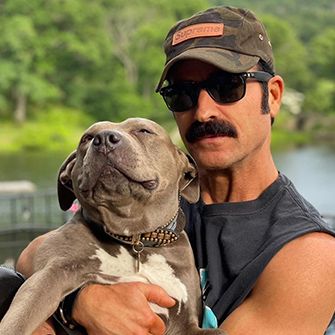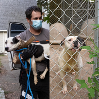 - Pit bull-mix-type dogs with multiple scars, possibly with lips or ears ripped off