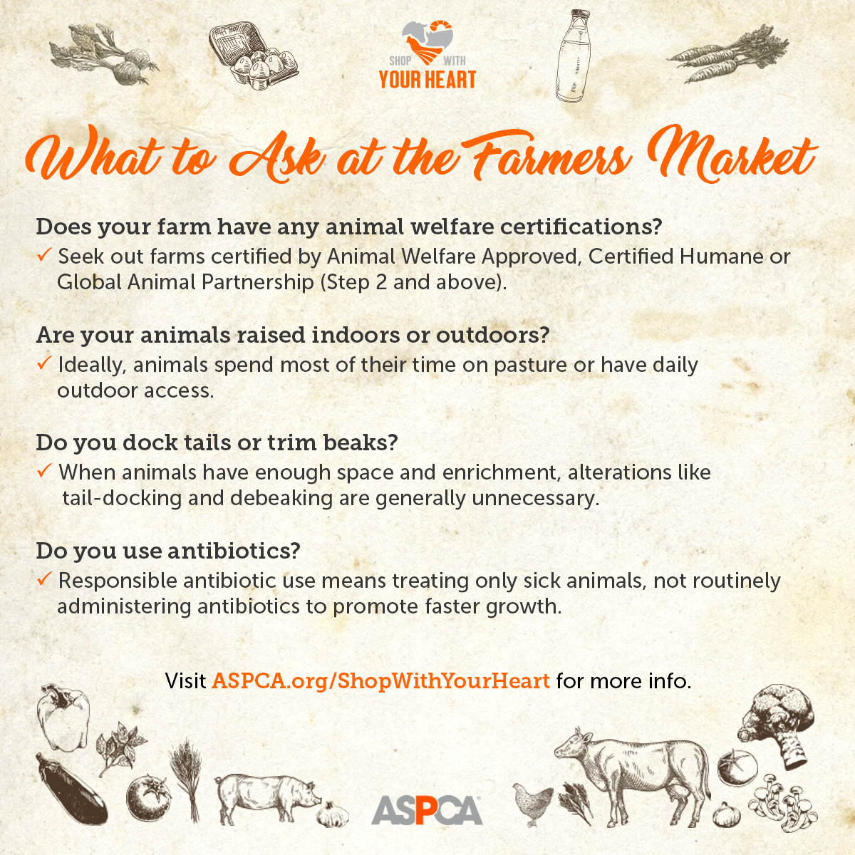 If you’re not sure where to start when talking to farmers at the market, we’re here to help. Check out our new video and resource guide, below, for fast tips on what you should look for to find higher-welfare meat, eggs and dairy at your local farmers market.