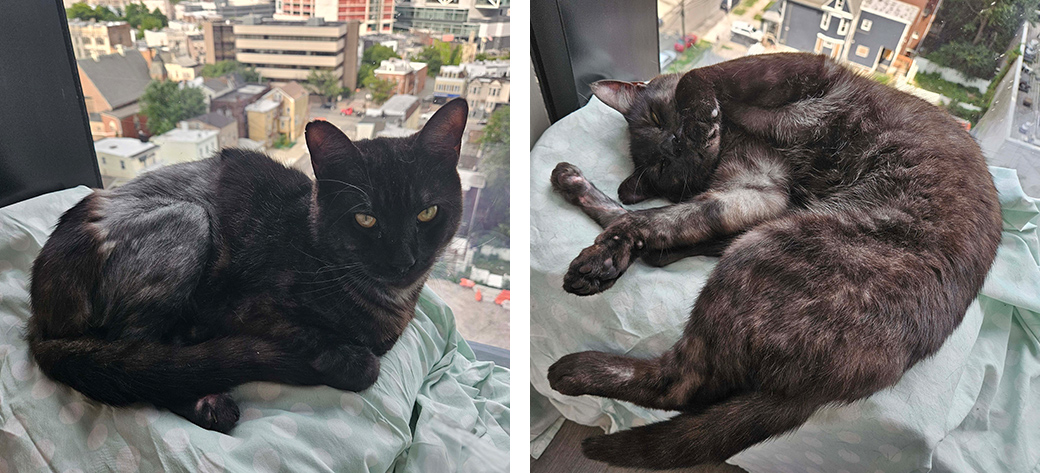Sonic enjoys napping on pillows in a window nook of Naijia’s 10th-floor apartment in Jersey City, New Jersey. He also loves playing with his mouse toy and cat wand.