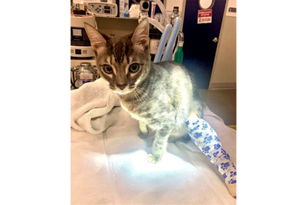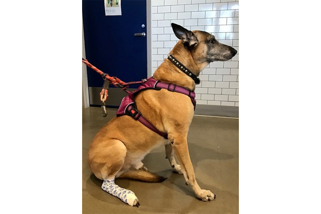 Raya’s right front leg and left hind leg were fractured. Drs. Victoria Koehler and Christina Hawkins applied splints, and Raya was reunited with her pet parent, Alfredo M.