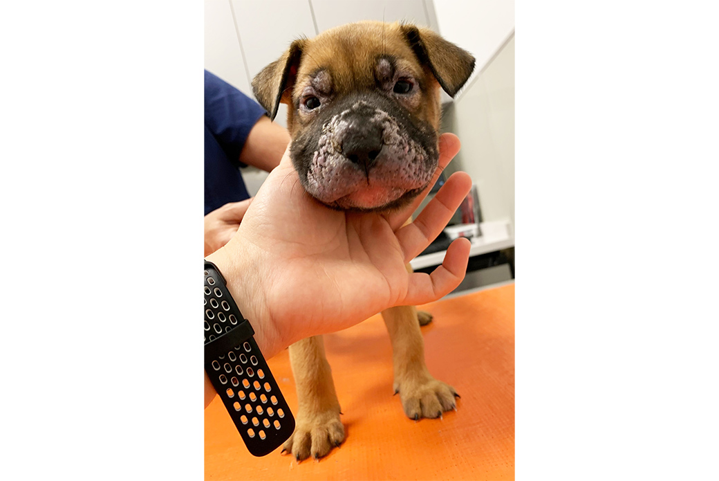 Puppy strangles usually affects puppies between one and six months of age. The first sign is acute swelling of the face and muzzle, which Dior experienced. The swelling is typically followed by the development of raised bumps and pustules on the animal’s face, muzzle and ears, which can spread to other parts of the body if not treated.