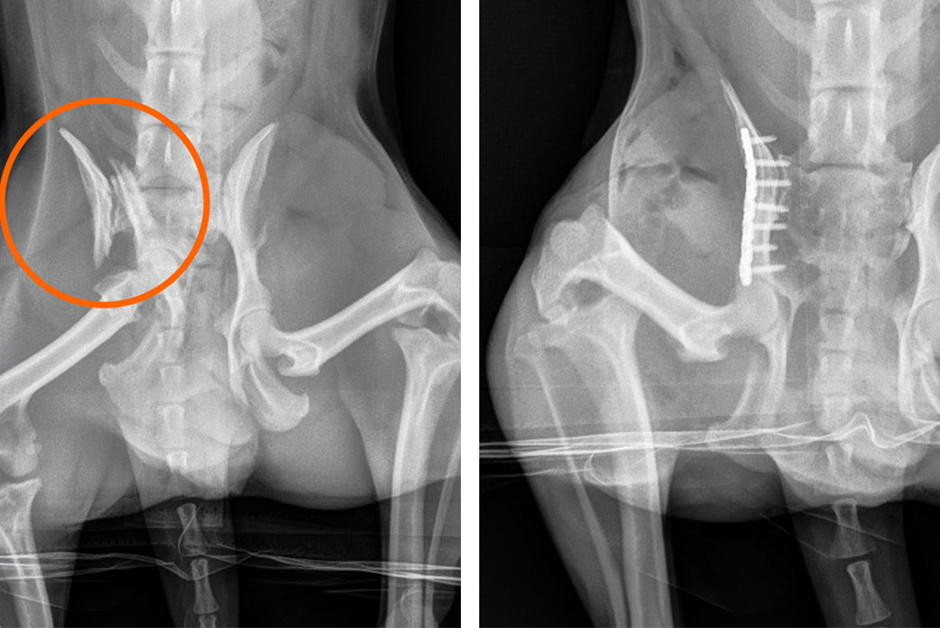 “For most pelvic fractures, especially with small dogs, pain medication and cage rest can work,” says Dr. Pandya. “But when I looked at his radiographs, I was concerned there may be damage to his caudal spinal cord — the tail end — as well, which may have explained the urinary incontinence.