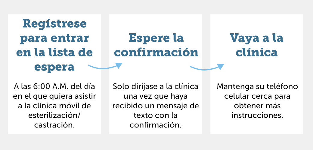| 4 | Le avisaremos por mensaje de texto cuando estemos listos para que usted y sus mascotas se acerquen a la clínica. No vaya a la clínica hasta que reciba el mensaje de texto para reducir la aglomeración. Si no llega dentro de los 10 minutos posteriores al mensaje de texto “ready” (“listo”), puede perder su lugar en la lista. * Como parte del proceso de admisión, un veterinario examinará a los animales para determinar si están sanos y pueden someterse a cirugía. Es posible que no se considere a su mascota para los servicios debido a razones médicas o de capacidad después de su llegada. |