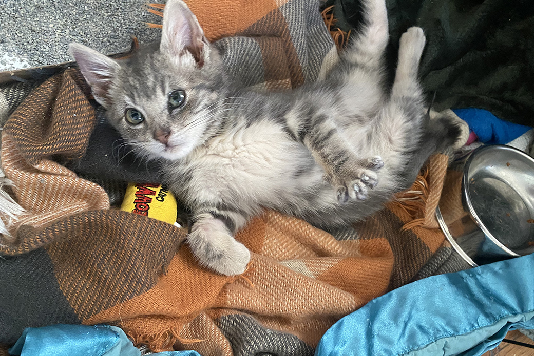 Soon after their initial chat with Valeria, Manuel and Dennis received a text from her with a photo of a tiny grey tabby kitten – exactly who they had been looking for.