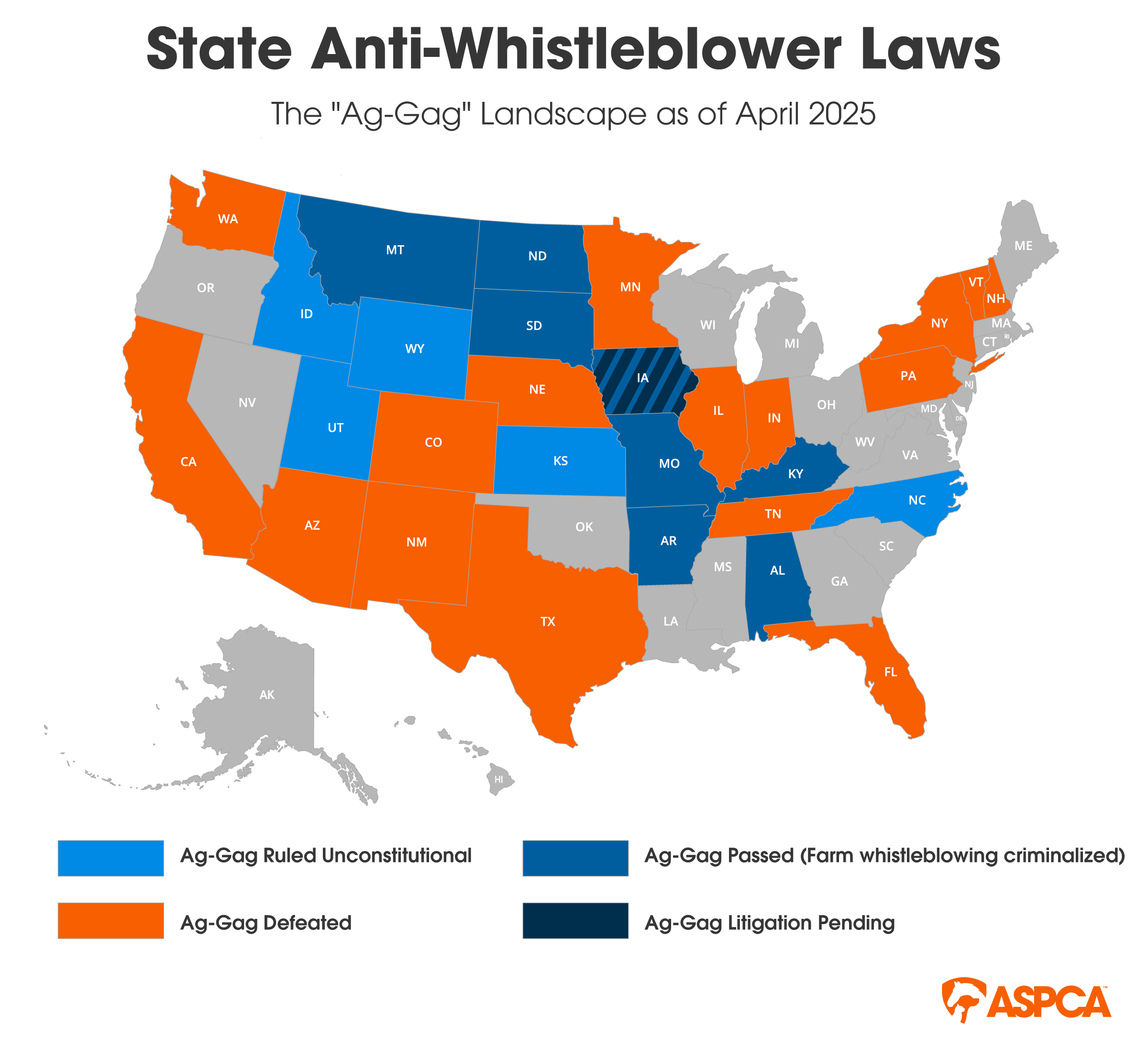 Over the past decade, the animal-agriculture industry has been behind the introduction of "ag-gag" bills in more than half of all state legislatures across the country. These dangerous bills are designed to silence whistleblowers revealing animal abuses on industrial farms. Ag-gag laws currently exist in six states, penalizing whistleblowers who investigate the day-to-day activities of industrial farms, including the recording, possession or distribution of photos, video and/or audio at a farm. To date, five additional ag-gag laws have been struck down by courts as unconstitutional. [Jump to a list of state bills and laws]